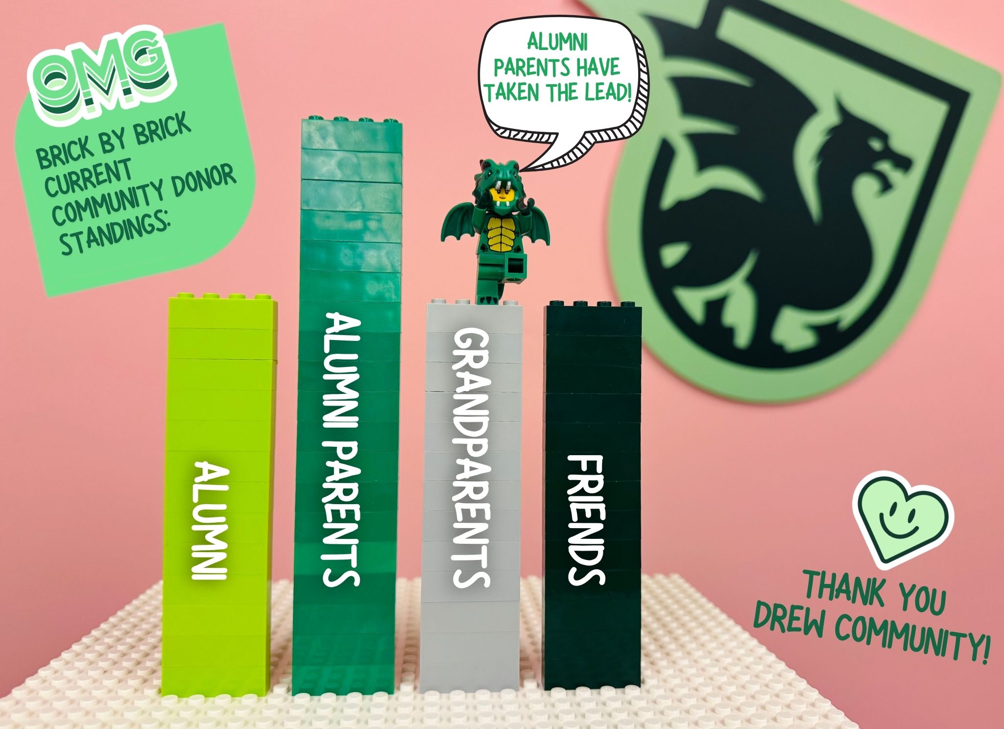 Instead of a traditional fundraising thermometer, we’re once again tracking overall current family participation with a special top-secret LEGO kit. As gifts come in, we’ll assemble the pieces to reveal a Drew-themed mystery build in the front lobby.